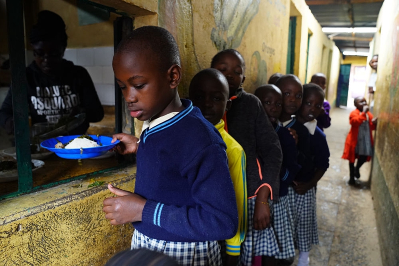4月28日,在位于肯尼亞內羅畢馬薩雷一所小學(xué),孩子們排隊領(lǐng)取免費午餐。新華社記者董江輝攝