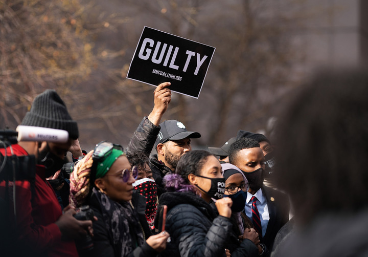 2021年4月20日,民眾手舉“有罪”的標語(yǔ)聚集在美國明尼阿波利斯市的法庭附近。新華社發(fā)(本·布魯爾攝)