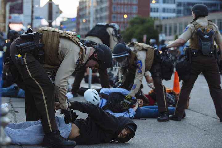 2020年5月31日,抗議示威者在美國明尼蘇達州明尼阿波利斯市被警察逮捕。喬治·弗洛伊德2020年5月遭白人警察暴力執法后窒息死亡,引發(fā)全美大規??棺h。新華社發(fā)(安格斯·亞歷山大攝)