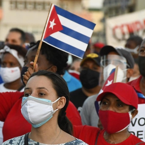 2021年7月17日,約10萬(wàn)民眾在古巴首都哈瓦那參加愛(ài)國集會(huì ),抗議美國對古巴長(cháng)期封鎖、反對美國政府資助反古勢力煽動(dòng)騷亂。新華社發(fā)(華金·埃爾南德斯攝)