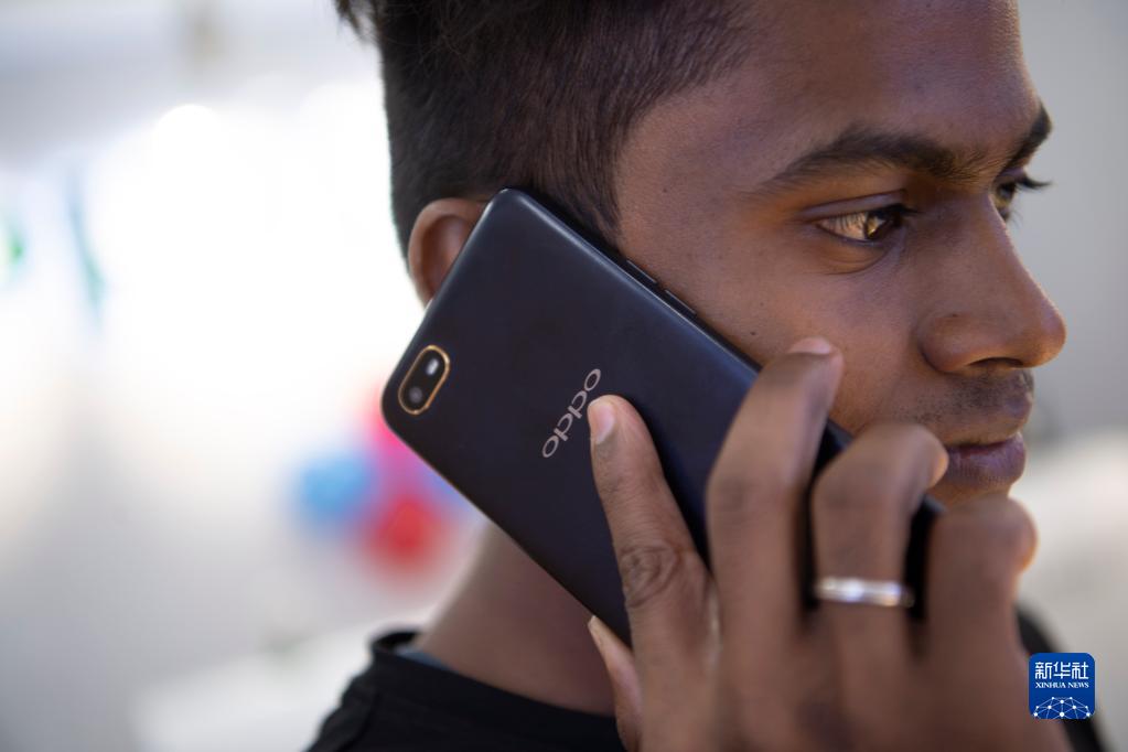 2019年10月8日,一名男子在印度金奈的一家商場(chǎng)使用中國品牌的手機。新華社記者 呂小煒 攝