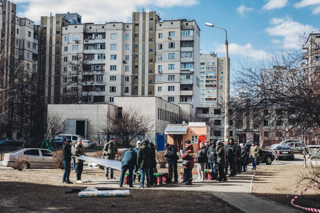 3月17日,人們在烏克蘭基輔領(lǐng)取用來(lái)遮擋窗戶(hù)的塑料布。新華社發(fā)(迭戈·埃雷拉攝)