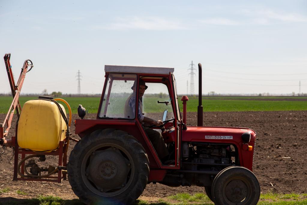4月15日,一名男子駕駛農用機械車(chē)輛行駛在塞爾維亞舊帕佐瓦市附近一處農田間。新華社記者石中玉攝