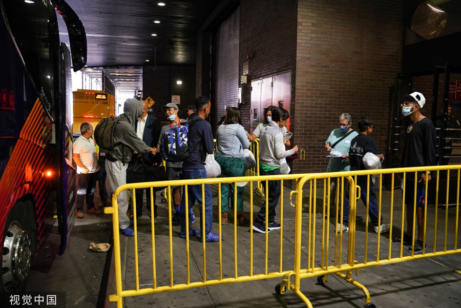 當地時(shí)間2022年9月4日,一輛載有越境移民的巴士抵達美國紐約市。(圖片來(lái)源:視覺(jué)中國)