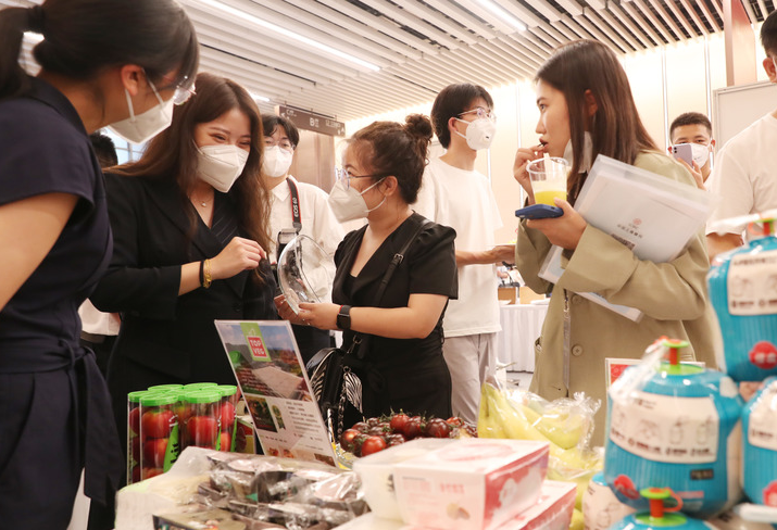 2022年8月30日,第五屆進(jìn)博會(huì )食品和醫療展區展前供需對接會(huì )嘉賓在參展企業(yè)展位前品嘗水果。 新華社記者 方喆 攝
