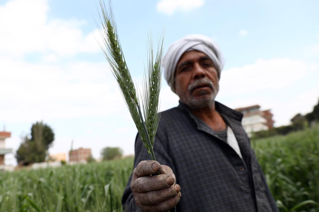 3月14日,農民在埃及蓋勒尤卜省的農田中展示麥穗。新華社發(fā)(艾哈邁德·戈馬攝)