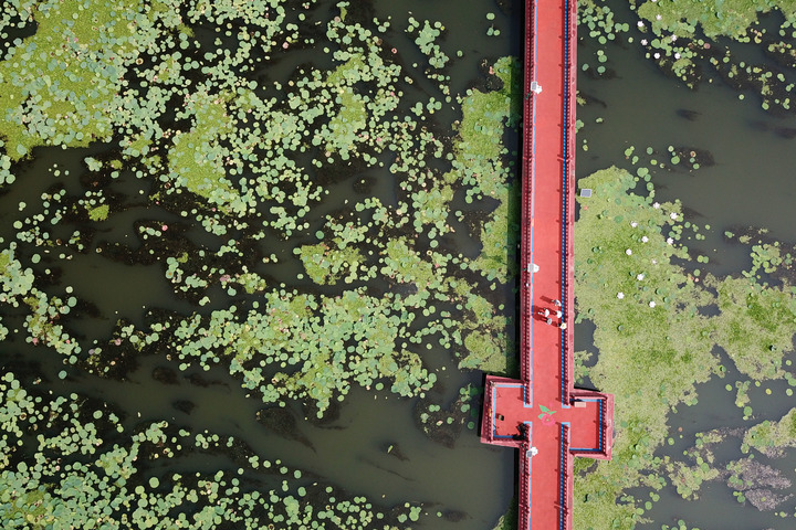 濟寧市微山湖旅游區荷園景色。微山湖旅游區內有微山湖國家濕地公園等。新華社記者徐速繪攝