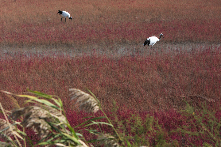 在位于盤(pán)錦的遼河三角洲濕地包括蘆葦沼澤、淺海海域、河流庫塘、水稻田等濕地類(lèi)型。特殊環(huán)境孕育出的堿蓬草鋪滿(mǎn)灘涂,一到秋天這里就成了“紅色海岸線(xiàn)”。新華社記者王乙杰攝