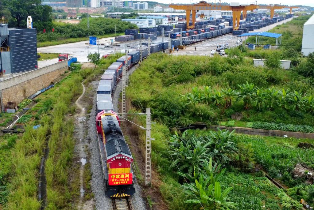 5月15日,搭載2600噸白糖的中歐班列從南寧國際鐵路港出發(fā)駛向哈薩克斯坦阿拉木圖。新華社記者張愛(ài)林攝