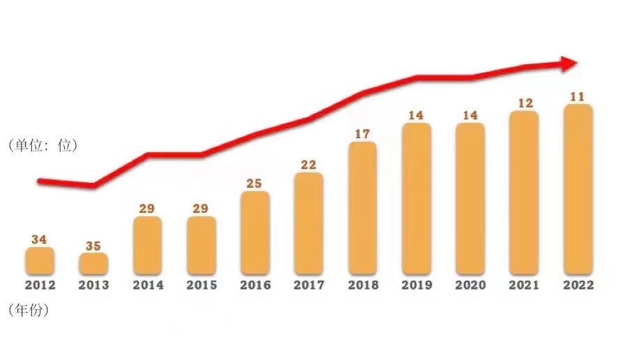十年來(lái),中國的全社會(huì )研發(fā)投入與國內生產(chǎn)總值的比例由1.91%提高到2.44%;2021年中國全社會(huì )研發(fā)經(jīng)費是2012年的2.7倍,基礎研究經(jīng)費是2012年的3.4倍;據世界知識產(chǎn)權組織發(fā)布的《全球創(chuàng )新指數2022》,中國排名從十年前第34名上升至第11名。