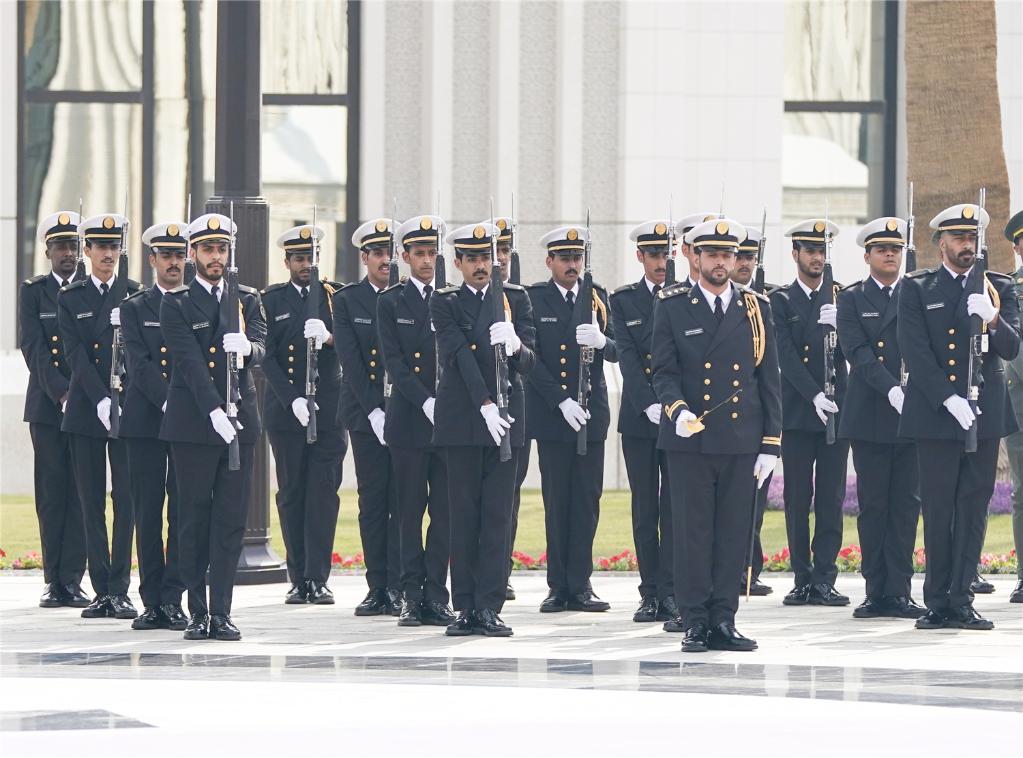 習近平在穆罕默德王儲陪同下檢閱王宮儀仗隊。沙特王宮衛隊以傳統執劍禮儀向習近平表示最隆重歡迎。