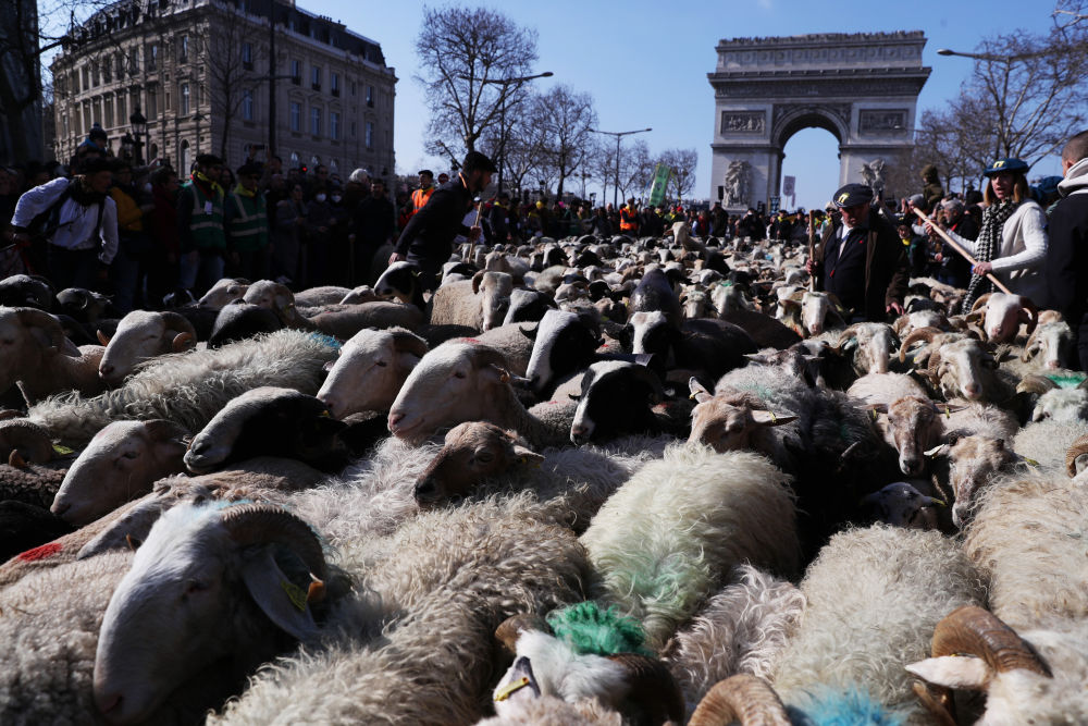 ↑2022年3月6日,2022只綿羊聚集在法國巴黎香榭麗舍大街上。這場(chǎng)別開(kāi)生面的活動(dòng)是第58屆法國國際農業(yè)博覽會(huì )的閉幕活動(dòng)。