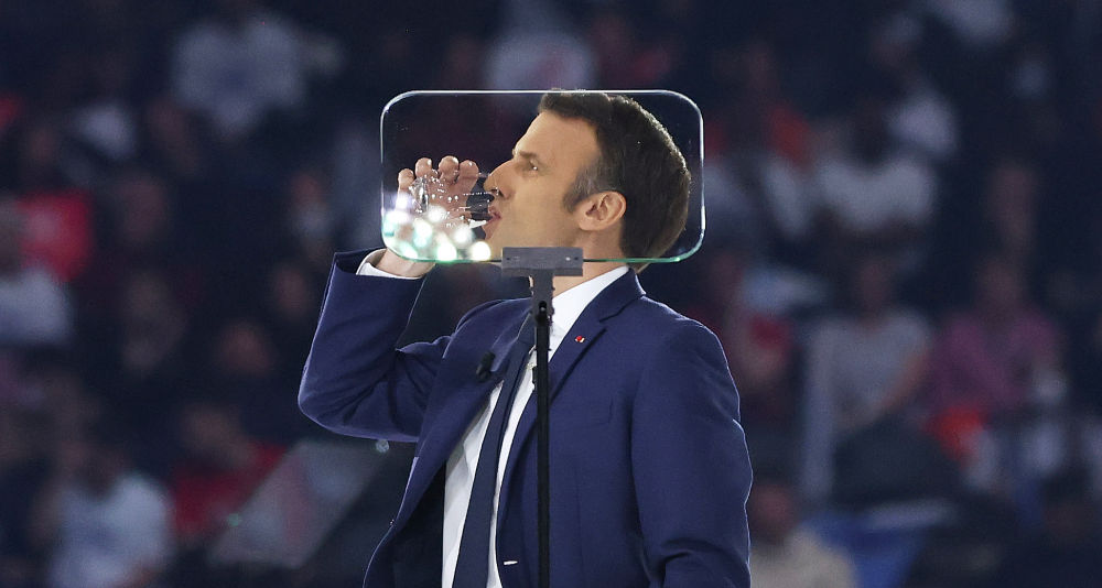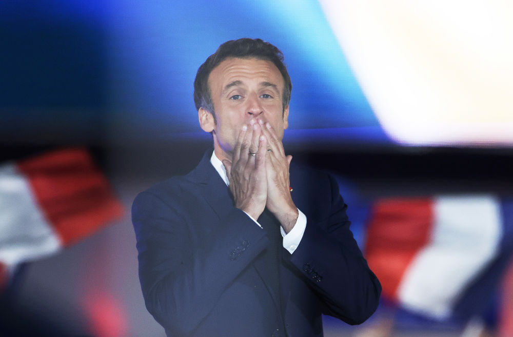 ↑2022年4月24日,法國現任總統馬克龍在巴黎出席選舉后的慶祝集會(huì )。