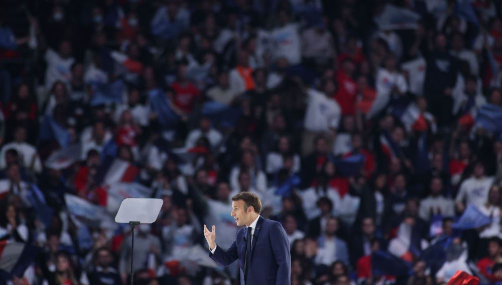 ↑2022年4月2日,法國總統馬克龍在巴黎附近的拉德芳斯體育館出席競選集會(huì )。