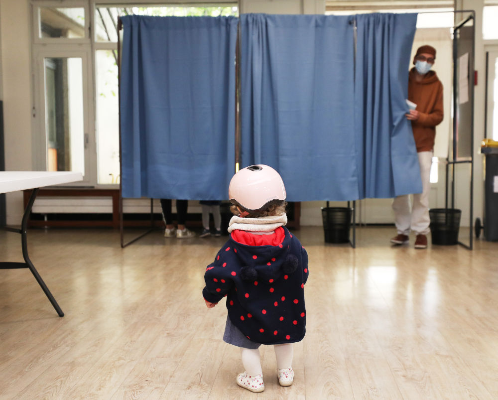 ↑2022年4月24日,在法國巴黎附近的克里希市一家投票站,一名女孩陪家長(cháng)前來(lái)參加法國總統選舉第二輪投票。