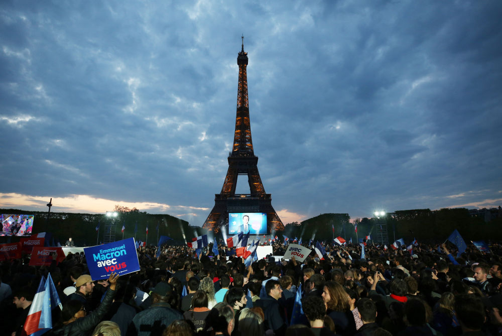 ↑2022年4月24日,人們在法國巴黎埃菲爾鐵塔下參加現任總統馬克龍的選后慶祝集會(huì )。