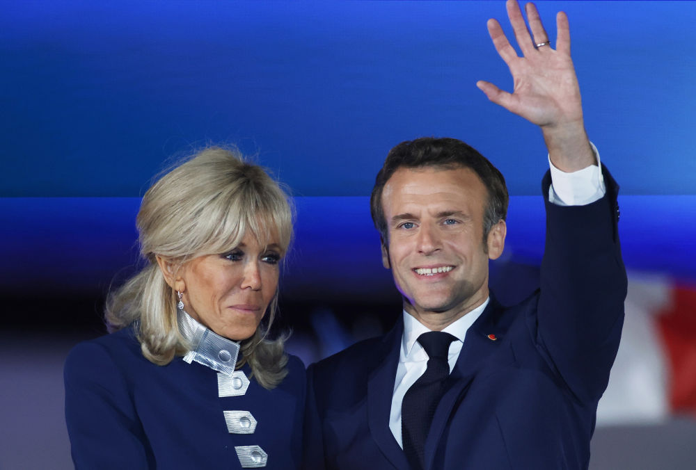 ↑2022年4月24日,法國現任總統馬克龍和夫人布麗吉特在巴黎出席選舉后的慶祝集會(huì )。
