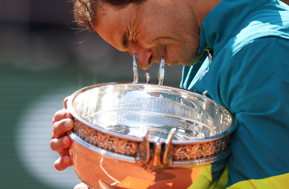 ↑2022年6月5日,2022法國網(wǎng)球公開(kāi)賽男子單打冠軍西班牙選手納達爾在頒獎儀式上手捧冠軍獎杯。