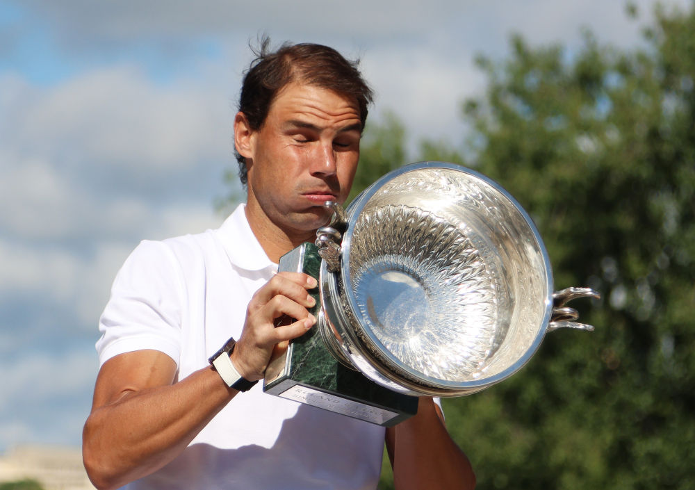 ↑2022年6月6日,獲得2022法國網(wǎng)球公開(kāi)賽男子單打冠軍的納達爾手捧獎杯在巴黎亞歷山大三世橋合影留念。