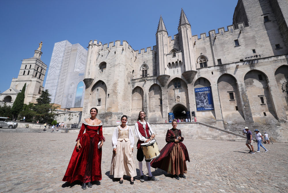 ↑2022年7月19日,在法國南部城市阿維尼翁舉行的戲劇節上,演員身著(zhù)戲服在教皇宮前推介自己的劇目。