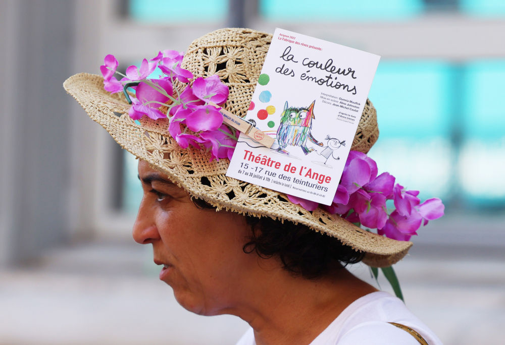 ↑2022年7月19日,在法國南部城市阿維尼翁舉行的戲劇節上,一名演員在街頭向人們推薦劇目。
