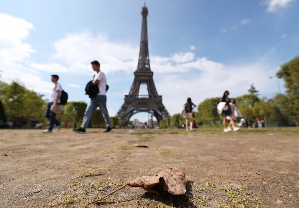 埃菲爾鐵塔下,因遭遇歷史性干旱而光禿禿的草坪有枯葉點(diǎn)綴其間,讓人恍惚深秋已至。