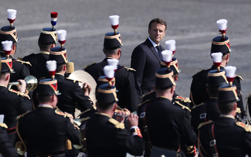 ↑2022年7月14日,法國總統馬克龍在巴黎協(xié)和廣場(chǎng)國慶閱兵式現場(chǎng)檢閱隊伍。