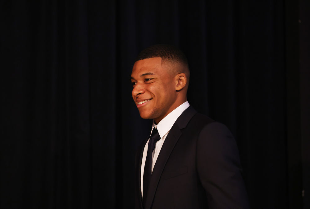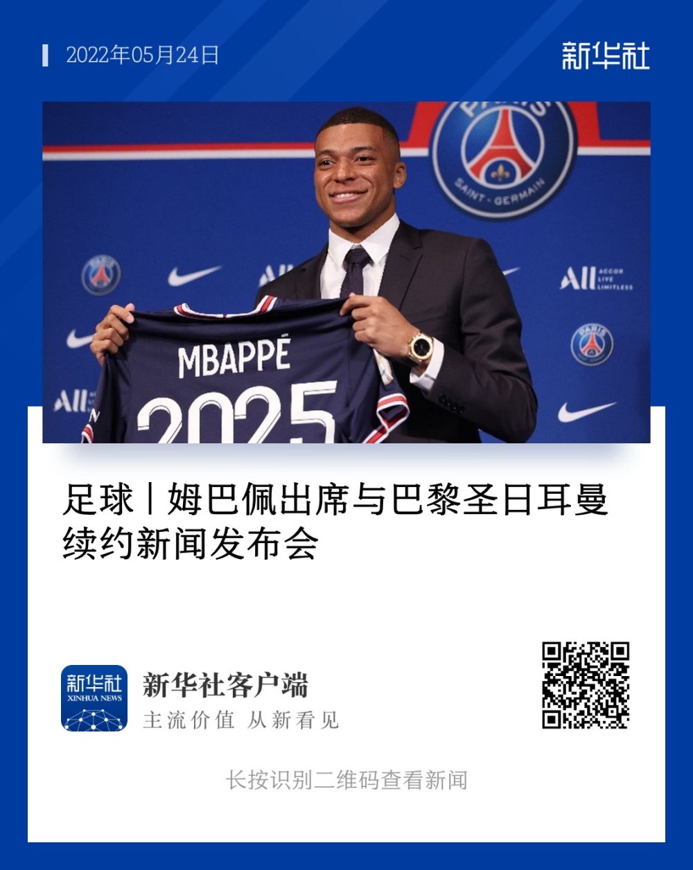 ↑2022年5月23日,在法國巴黎王子公園球場(chǎng),姆巴佩出席與巴黎圣日耳曼俱樂(lè )部續約的新聞發(fā)布會(huì )。