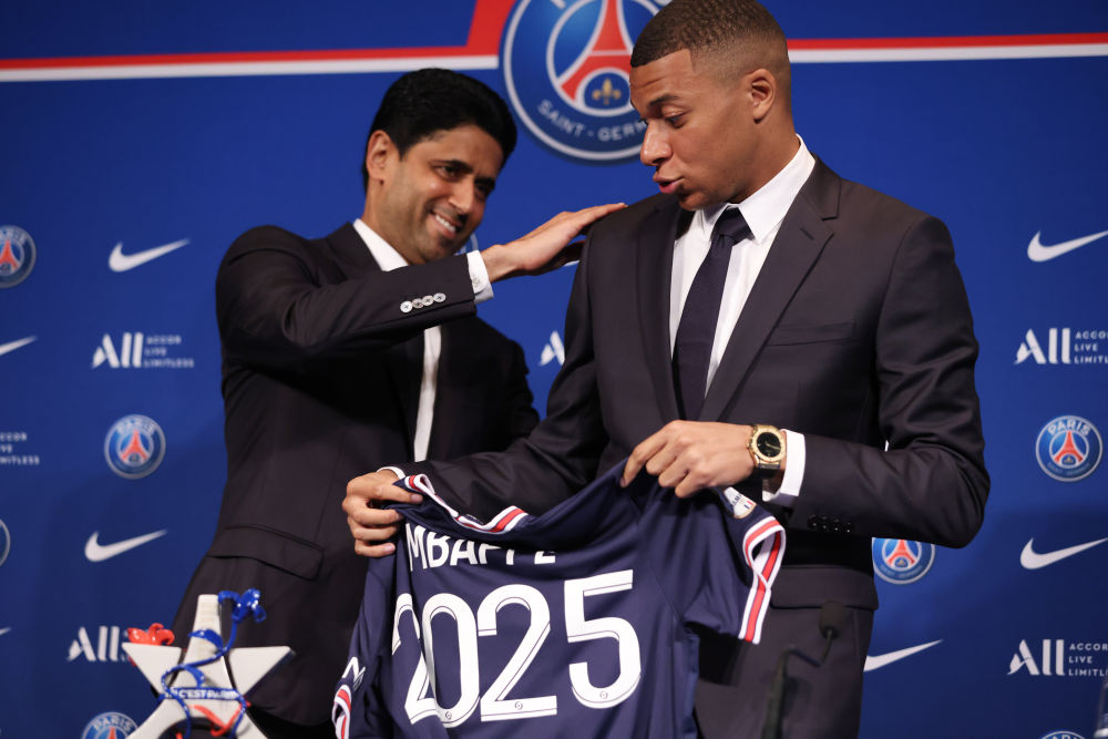 ↑2022年5月23日,在法國巴黎王子公園球場(chǎng),姆巴佩(右)與巴黎圣日耳曼俱樂(lè )部主席納賽爾出席與巴黎圣日耳曼俱樂(lè )部續約的新聞發(fā)布會(huì )。