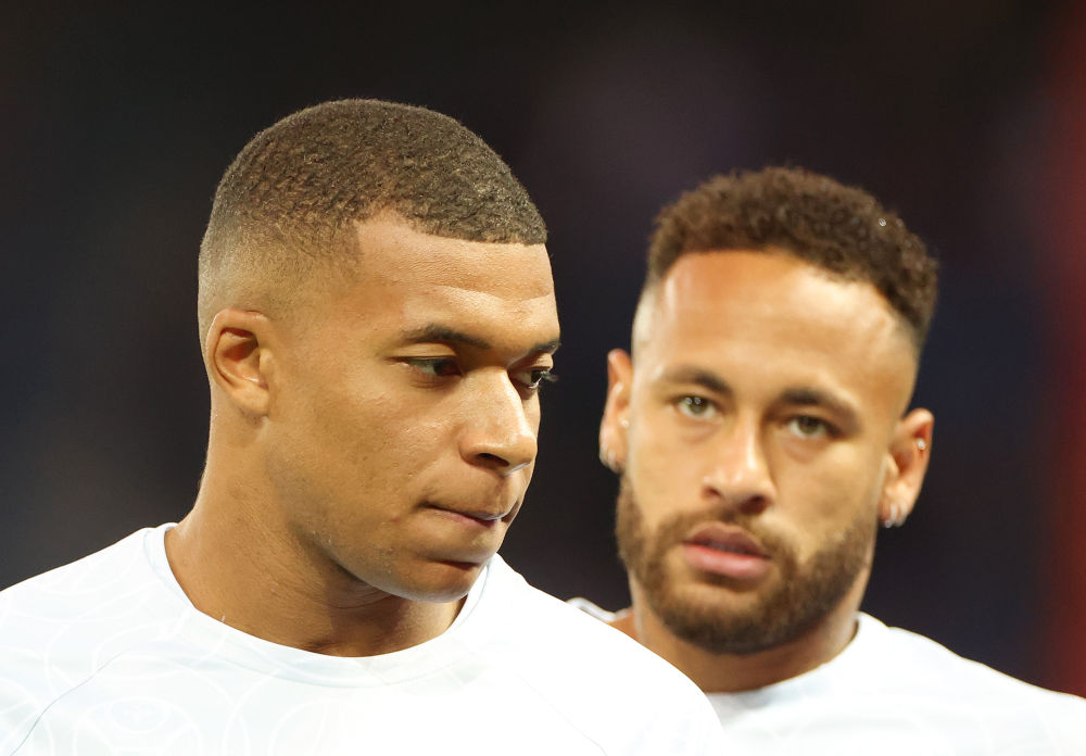 ↑2022年9月6日,巴黎圣日耳曼隊球員姆巴佩(左)和內馬爾在賽前熱身。