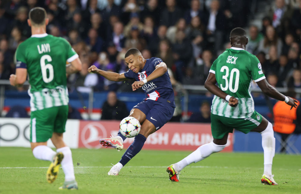 ↑2022年10月25日,巴黎圣日耳曼隊球員姆巴佩在2022-2023賽季歐洲足球冠軍聯(lián)賽小組賽H組第五輪比賽中射門(mén)。