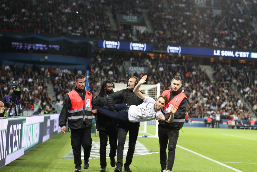 ↑2022年10月16日,在2022-2023賽季法國足球甲級聯(lián)賽第11輪比賽中,安保人員將闖入球場(chǎng)的示威者抬走。