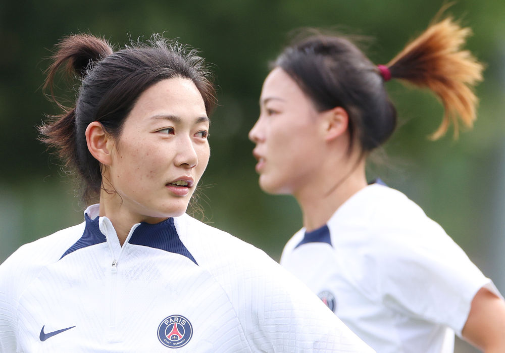 ↑2022年9月16日,租借加盟巴黎圣日耳曼女足的中國女足國腳楊莉娜(左)、李夢(mèng)雯在位于巴黎近郊布日瓦勒的訓練基地參加賽前訓練。