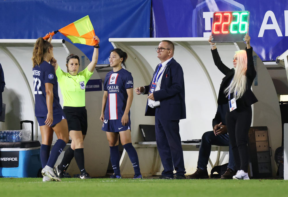 ↑2022年9月9日,租借加盟巴黎圣日耳曼女足的李夢(mèng)雯(左三)在2022-2023賽季法國女子足球甲級聯(lián)賽第一輪比賽中準備替補上場(chǎng)。