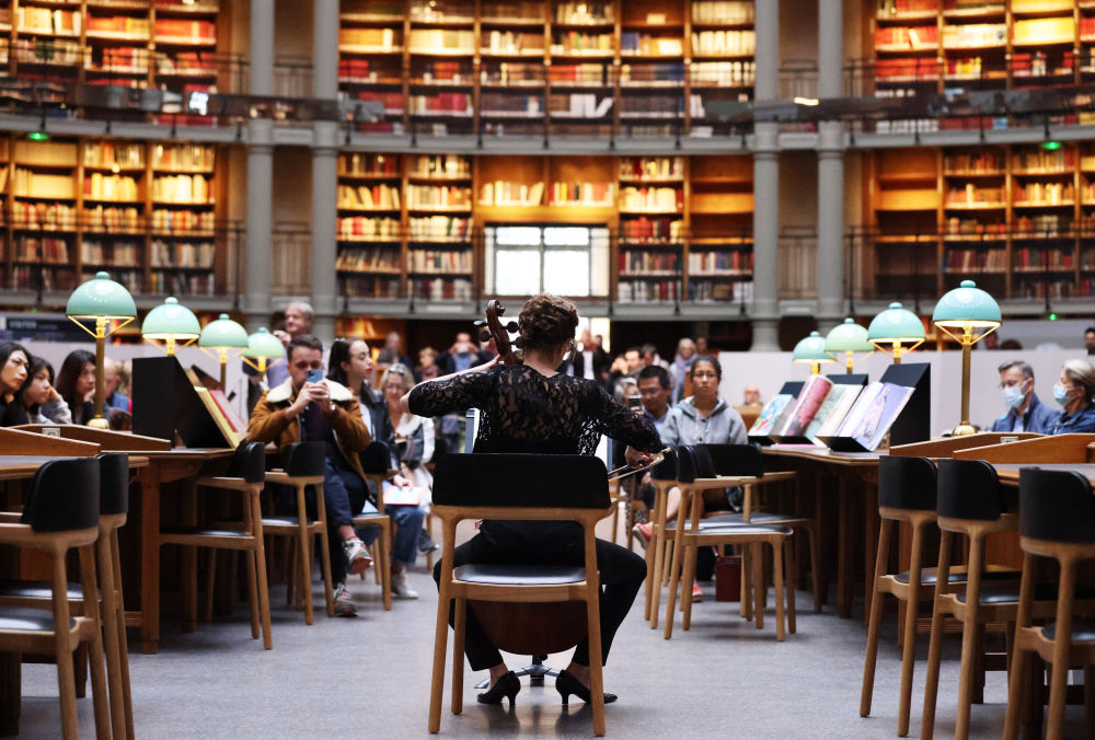 ↑2022年9月17日,在位于巴黎的法國國家圖書(shū)館黎塞留館,人們在“橢圓大廳”聆聽(tīng)大提琴家的表演。