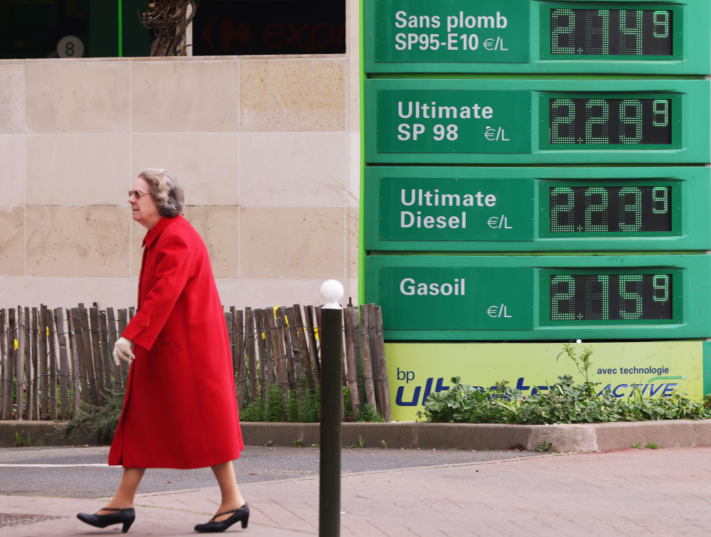 ↑2022年3月16日,一名老人走過(guò)法國巴黎一處加油站。