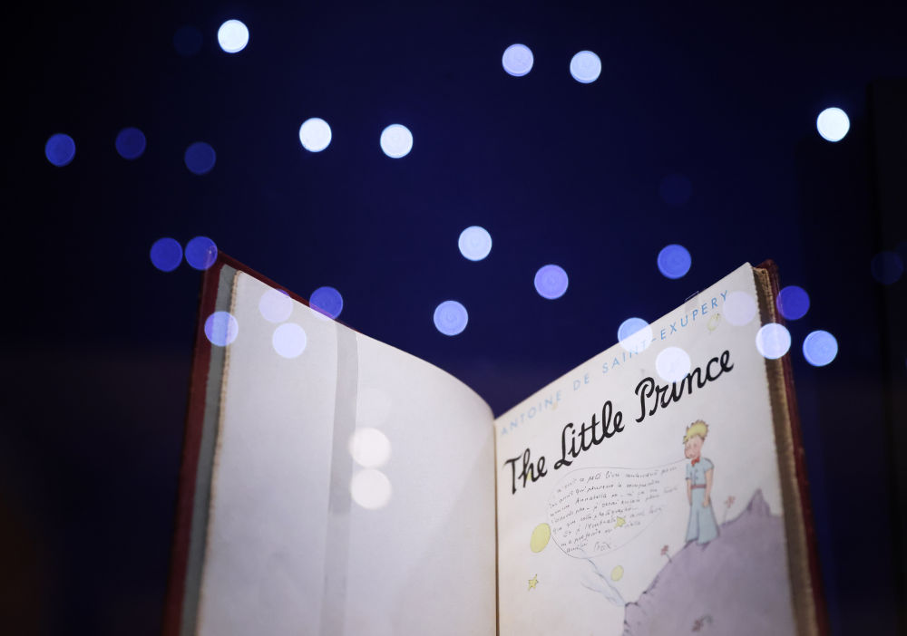 ↑2022年2月23日在法國巴黎裝飾藝術(shù)博物館舉行的“遇見(jiàn)小王子”展上拍攝的一本有作者簽名留言的英文版本的《小王子》。