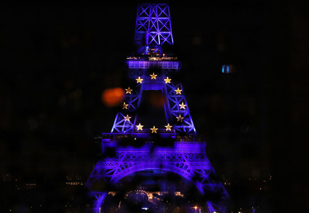 ↑2022年1月1日拍攝的被藍色燈光點(diǎn)亮的埃菲爾鐵塔。當日,法國多地地標建筑相繼點(diǎn)亮象征歐盟旗幟顏色的藍色,慶祝法國輪任歐盟主席國。