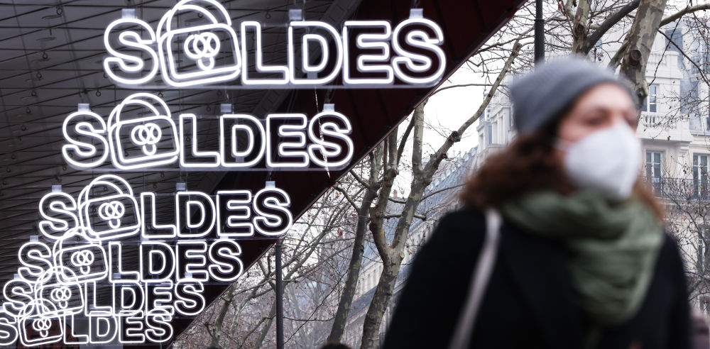 ↑2022年1月12日,一名女子走過(guò)法國巴黎街頭的打折季廣告。