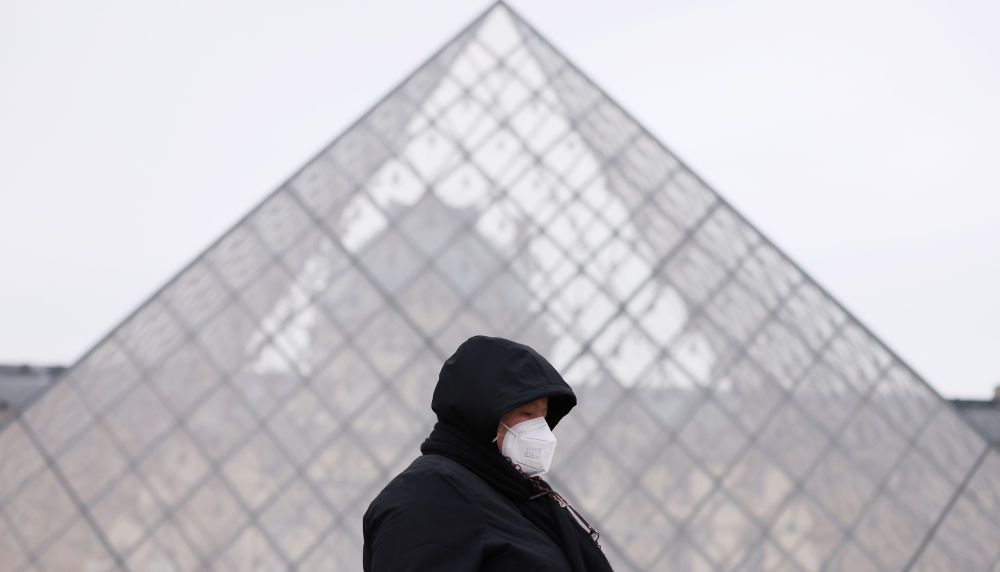 ↑2022年1月19日,一名女子走過(guò)法國巴黎盧浮宮的玻璃金字塔。
