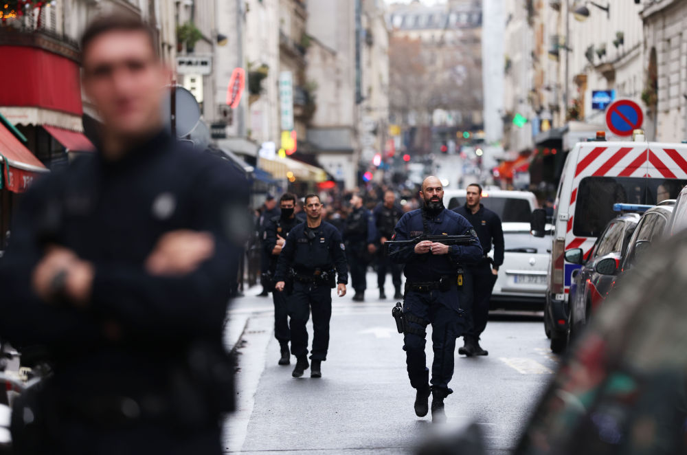 ↑2022年12月23日,警察在法國巴黎10區發(fā)生槍擊事件的街口警戒。槍擊事件導致3人死亡、多人受傷。