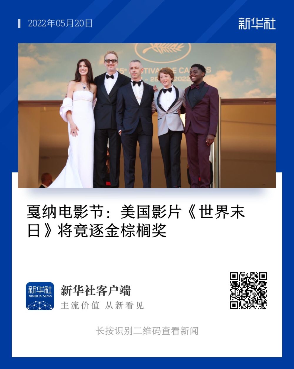 ↑2022年5月20日,美國影片《世界末日》演員安妮·海瑟薇亮相拍照式。