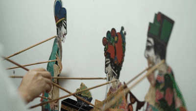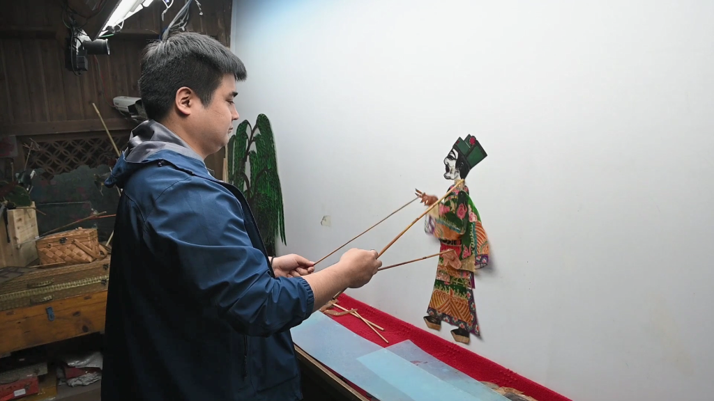 皮影藝人手持皮影靠子
