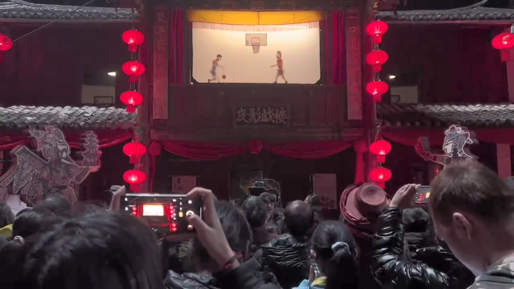 為村里的老戲迷們表演了一場(chǎng)籃球主題的皮影戲