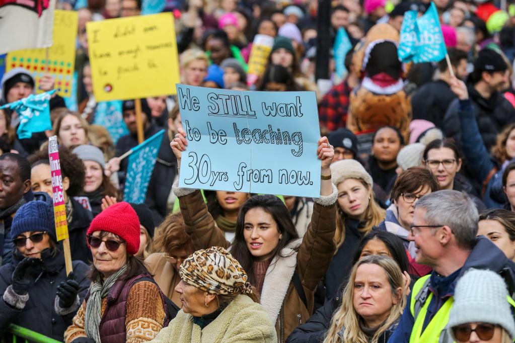 2月1日,人們在英國倫敦參加罷工游行。當日,約50萬(wàn)英國教師、火車(chē)司機和公務(wù)員舉行罷工,要求增加薪酬。新華社發(fā)