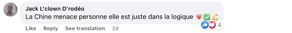 網(wǎng)友杰克·羅德奧用法語(yǔ)留言說(shuō):“中國一心發(fā)展,不對任何人構成威脅?!?/p>