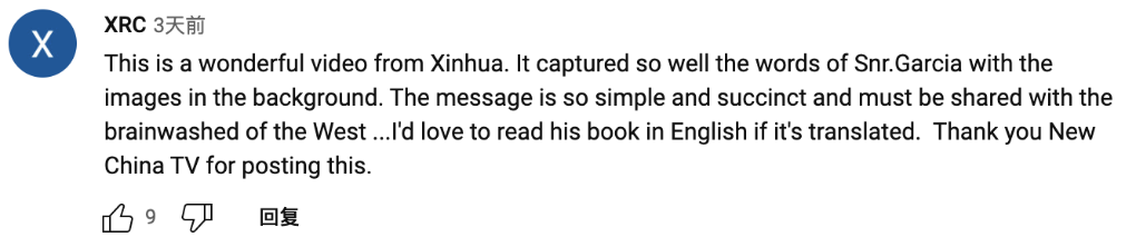 網(wǎng)友XRC留言說(shuō):“新華社這條視頻太棒了,它給我們傳達了一個(gè)明晰的信息,必須要分享給那些被洗腦的西方人看看。”