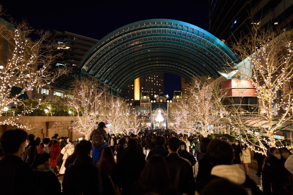 2022年12月25日,游客在日本東京惠比壽花園觀(guān)賞燈光秀。新華社記者張笑宇攝
