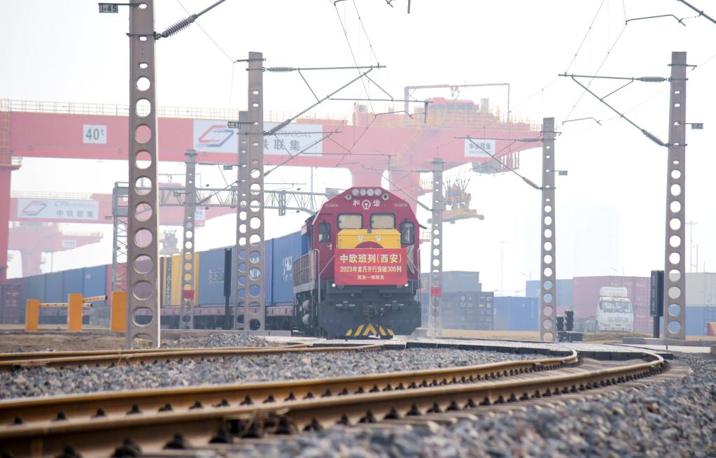 滿(mǎn)載日用百貨的X8151次中歐班列從西安國際港站駛出,開(kāi)往白俄羅斯首都明斯克(2023年2月1日攝)。新華社記者李一博攝
