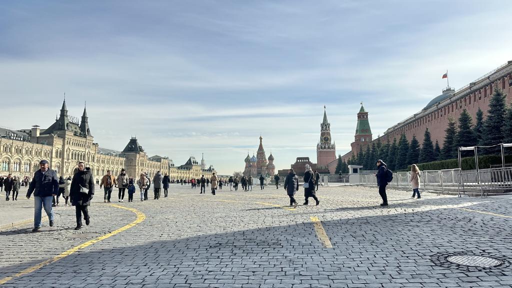 莫斯科紅場(chǎng)上,藍天白云,很多市民趁著(zhù)好天氣外出游玩。
